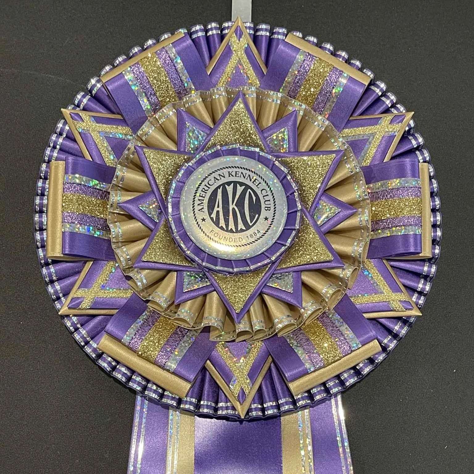 This 8 inch rosette features 6 points and folds on a bed of pleated ribbon in the traditional style.