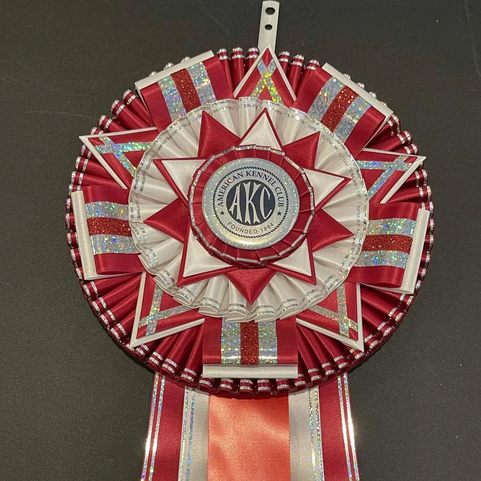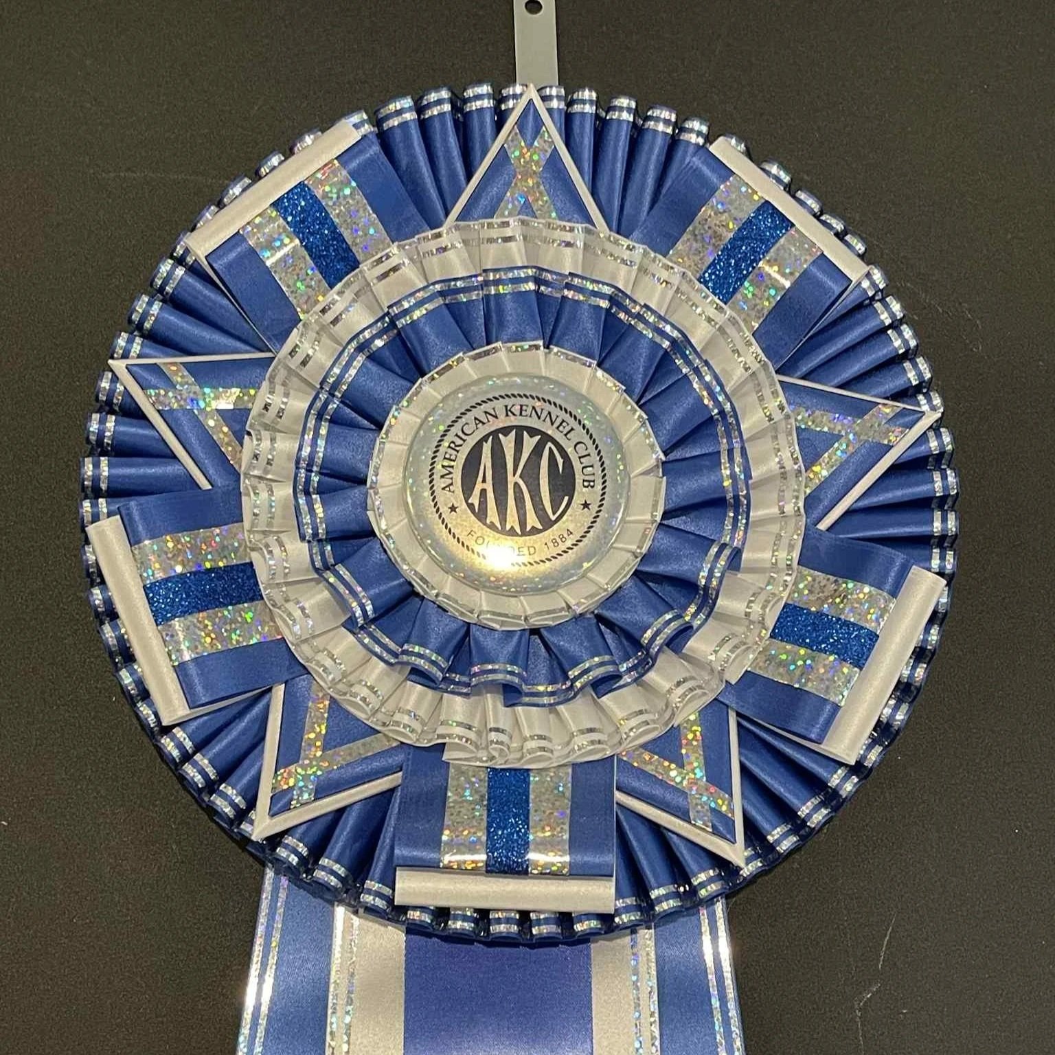 This stunning 12" rosette is sure to steal any show. It is an Artisan style rosette without pleating that uses layers of intricately folded ribbon to create a work of art that is sure to stop everyone in their tracks!